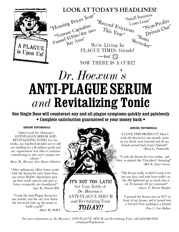 =====PILGRIMAGE TO THE MICROSOFT STORE Here's where a bunch of us donned monastic robes and made a pilgrimage to the Microsoft Store at the Astreon shopping mall - there to offer thanks, recite a liturgy, genuflect in the direction of Redmond, and find out Where Bill Wants Us To Go Today.=====OUR SUNDAY PICNIC So, this friend of mine, he works across the street from a 24 Hour Fitness gym. One day, he's walking down the street eating his lunch, and he stops to think about something... and suddenly notices he's got a row of people on treadmills staring out the gym's huge window at him, watching him eat. Thus, a great idea was born. We got a bucket of fried chicken, a dozen donuts, and a couple of lawn chairs... =====THE CONVERGENCE OF THE CONSUMER HERD We went shopping on the day after Thanksgiving. The TV said we had to. The sheep masks were our own idea. Baaaah! Buu-u-u-uy! Buu-u-u-uy! Baaaah!=====ANTI-PLAGUE SNAKE OIL FLYER I used to put this up around town. Like most of my best jokes, this was timely, and poked fun once again at the problems caused by the influx of dot-commers. It was done in the style of an old snake-oil remedy flyer, claiming to advertise a tonic that would solve your various econnomic and housing difficulties.- On-screen GIF version