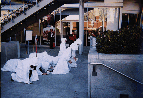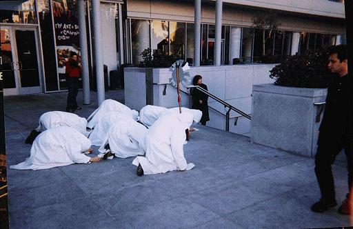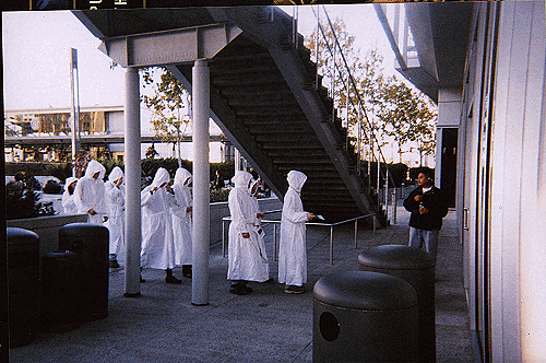 Here's where we were completely stymied by a well-placed plainclothes security guard. We almost had him bullshitted, saying that we were there to do an official promotion, but he called up the chain of command until finally a higher up came out and asked us to "please wait on the other side of that silver line in the ground... this is private property." Then they retreated to behind the glass doors and watched us. After 15 or 20 minutes, we realized they weren't coming back out. Very smooth.