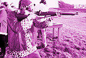 Except for a large stuffed crow overlooking a handwritten warning about possible fines and imprisonment for folks allowing children to misuse loaded firearms, there are few "things" in the store other than guns. But, this being the season for giving, the tiny shop is crowded with customers. The man behind the counter blithely regards the Santa crew and tries to fill their order. "I only have one box of 30-caliber rifle cartridges and one of the .30-06 Springfields left, and I'm all out of earplugs," says the man apologetically. "It's strange. There's been a rush on these. Holidays, I guess." The Santas buy what they can, loading up on alternates, and head north. It's easy for a city kid in a Santa suit to get lost, even just a few short miles from home. Eight miles can seem like 20 when familiar markers like corner bars, thrift stores, and legible street signs give way to unvarying green hills, dozing dairy cows, and the occasional llama. We had been up and down the same narrow stretch of winding road six times, and the desired address, which should have existed somewhere between the cobweb-covered 1500 and the subsequent gate irrationally marked 2360, had eluded both logic and technology. Finally, spotting a dairy farmer in knee-high rubber boots and overalls, we obtain the only answer possible: "You can't miss it: Just go a little ways and, at the top of the hill, turn right." Up a tree-lined road, not corresponding with the street address given us earlier, we come upon a small shed built under a large wooden sunshade. The constant rumbling report of gunfire echoes off the surrounding green hills, making the air vibrate and my neck twitch involuntarily. The shooting range (which chooses to remain nameless out of fear of overcrowding) offers 20 shooting benches with six banks of targets (at distances of 25 to 300 yards) and a trap range for shotguns. Already, barrel-chested shooters with cigars clenched in their teeth occupy most of the benches, and their children, more interested in range etiquette and firing accuracy, hardly give our merry band of armed St. Nicks a second glance. The range master, a 17-year veteran of this firing range with a Glock strapped to his hip, allows himself one good-natured smirk before taking our money and turning his attention to the other shooters, most of whom know his name. He's slightly more impressed when more carloads of Santas arrive, including the highly spangled Santa Deluxe and the jolly bearded Santa Rob, swelling our numbers to 15. Some of the regular shooters step back from their benches to eye us through the smoke of their smoldering cigars as more authoritative Santas offer novices firearm instruction. Humpy Claus and Santa Savalas make it look easy -- feet apart, grip loose, head cocked, shoulders straight -- effortlessly hitting their targets. On the rifle range, at 100 yards, I can barely make out which target is mine, much less tell if my bullets are coming close to hitting the page. The range master chuckles as I watch one of his regular shooters nailing clay pigeons that look like orange match heads at 300 yards. "We don't let you shoot at 200 or 300 yards unless you can sight in at 100 yards," says the range master, holding up a target with bullet holes less than an inch apart. I smile and nod from under my overlarge, shiny red hat. I feel more confident on the handgun range, enjoying the genteel pluck of a .22 six-shooter, but the recoil from the .45 finishes me off. Santarilla shows me a scar left by a hot casing that flew down her shirt the last time she tried to shoot a semiautomatic weapon. Humpy Claus talks about repacking his own ammo. The range master calls a cease-fire, and the owner's kid hurries down the firing line to check that the guns are unloaded and the actions are open. I watch the other Santas proficiently handling their weapons, looking like holiday vigilantes at a pop-art boot camp. I'm glad they're on my side. By the time I leave, the locals are lending us equipment and posing for pictures. "You guys are the best-behaved Santa crew I've ever seen here," says the range master. Holiday cheer all around.